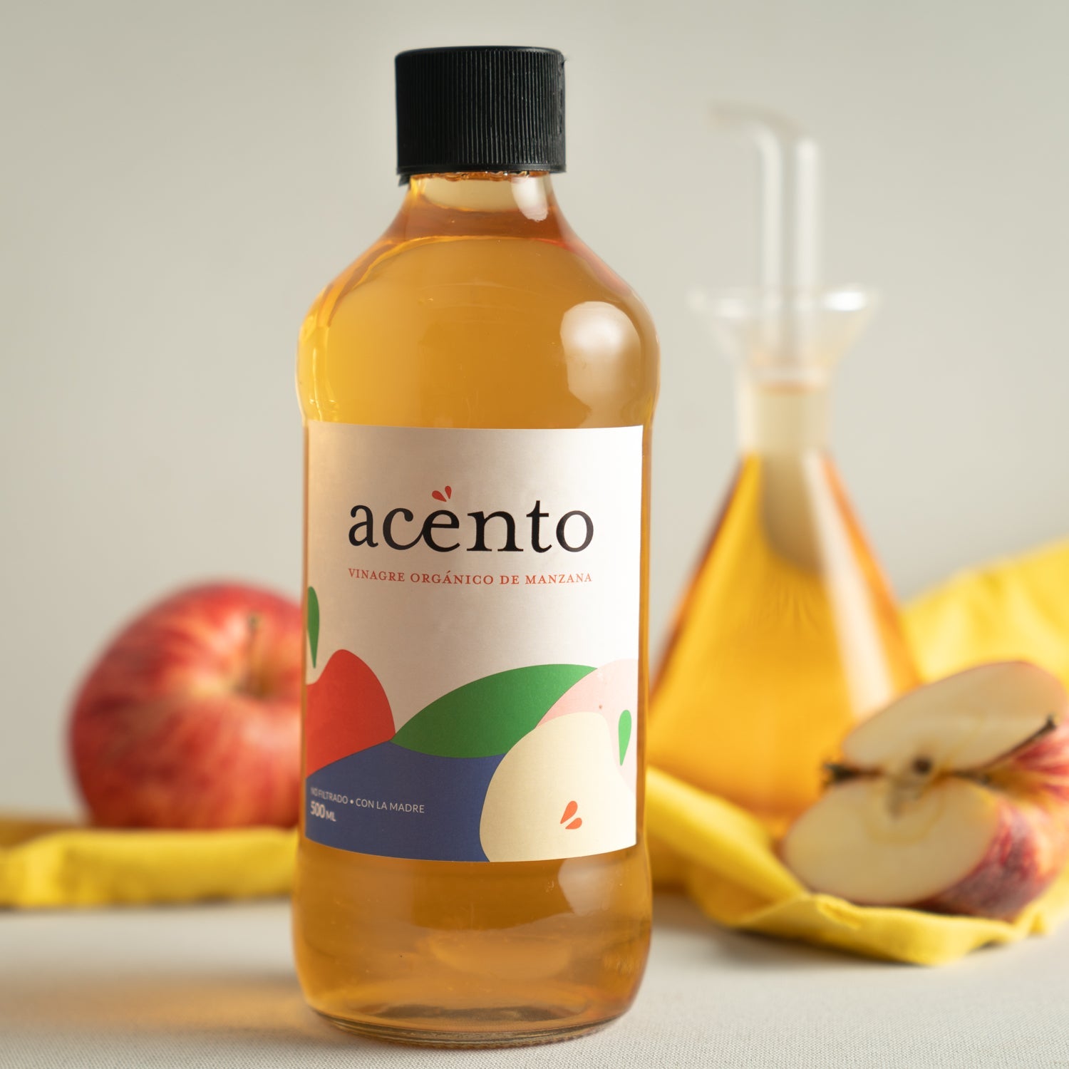 Vinagre acento está hecho con manzanas gala orgánica del predio Agrícola maquihuano. La cosecha va directo a fermentación creando un producto saludable y sustentable.