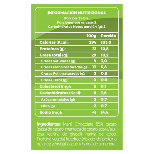 Bolitas de chocolate 85% cacao, rellenas con mantequilla de maní y proteína vegetal (aislado de proteína de arroz y arveja), cacao y harina de almendras.