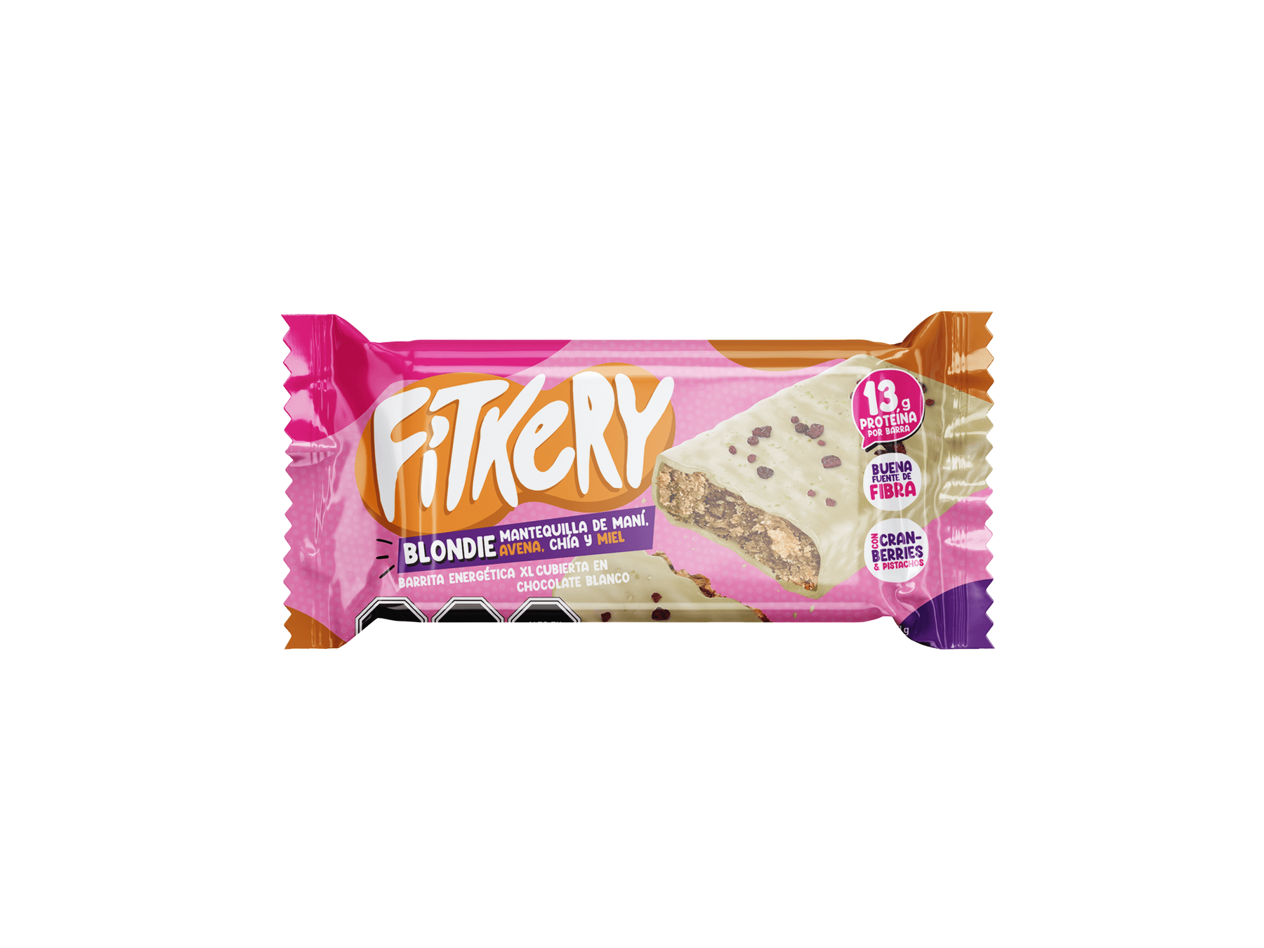 Única Barrita tamaño XL 100% natural en base a avena y mantequilla de maní. Bañada en chocolate blanco, con arándanos y pistachos. Endulzada con miel. 15 grs de proteína vegetal. Sin conservantes.
