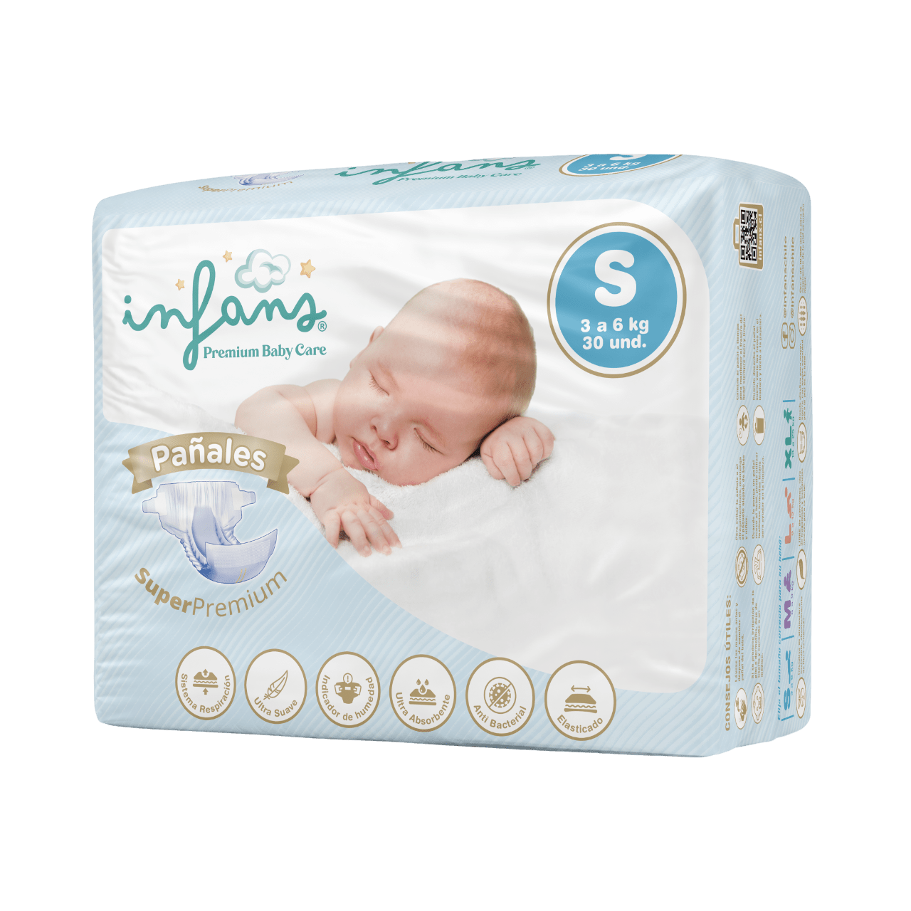 Pañales INFANS Premium Baby Care. Ofrece al bebé el mejor cuidado. Diseñados para brindar máxima comodidad y protección, son dermatológicamente testeados y suaves con la piel, reduciendo el riesgo de irritaciones. Su núcleo ultraabsorbente mantiene a tu bebé seco por más tiempo, garantizando frescura y bienestar. Con un ajuste ergonómico y materiales transpirables, permiten libertad de movimiento y protección duradera. Cada paquete incluye 30 unidades, perfectas para la rutina diaria de tu pequeño. Calidad, suavidad y absorción superior con INFANS Premium Baby Care.