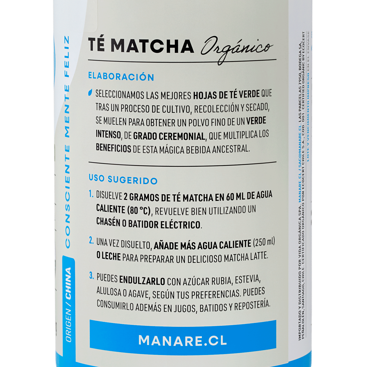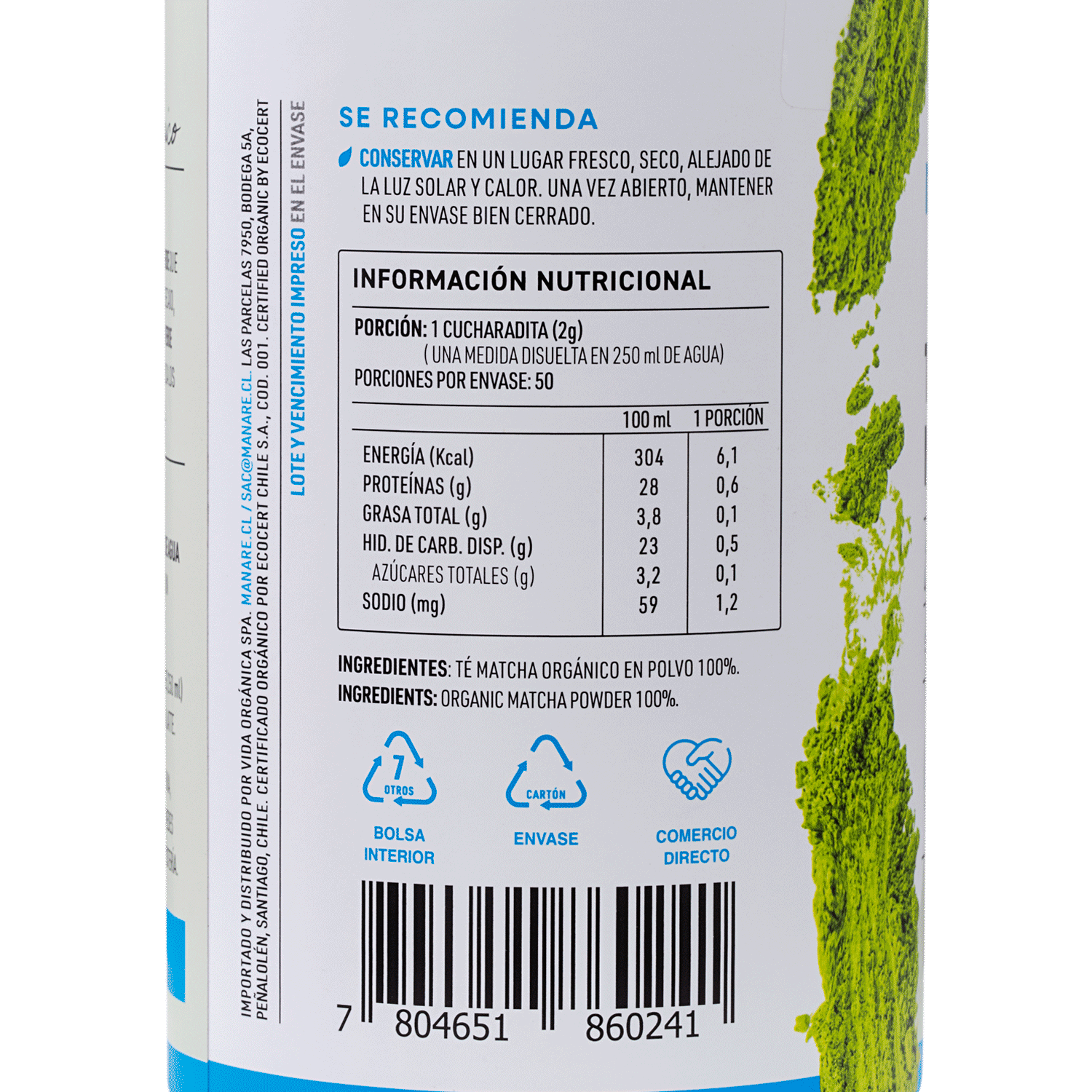 Té Matcha en polvo orgánico Manare 100 grs. Té verde con altos niveles de antioxidantes sumado a un intenso sabor y un brillante color.
