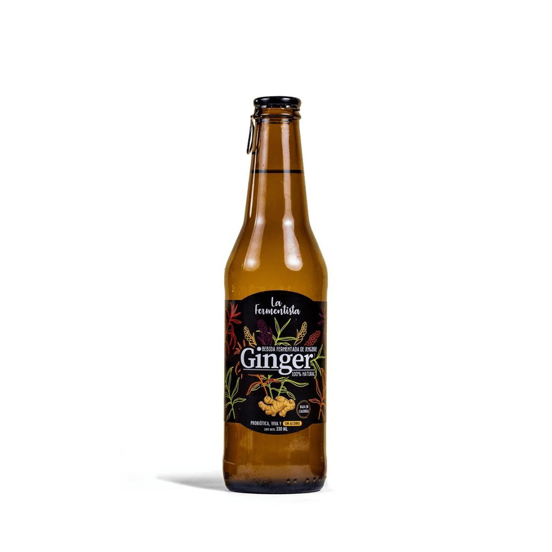 Bebida fermentada de Jengibre con Kefir de Agua. Ingredientes naturales y prensados en frío, sin pasteurizar, baja en calorías, burbujeante y sin alcohol.