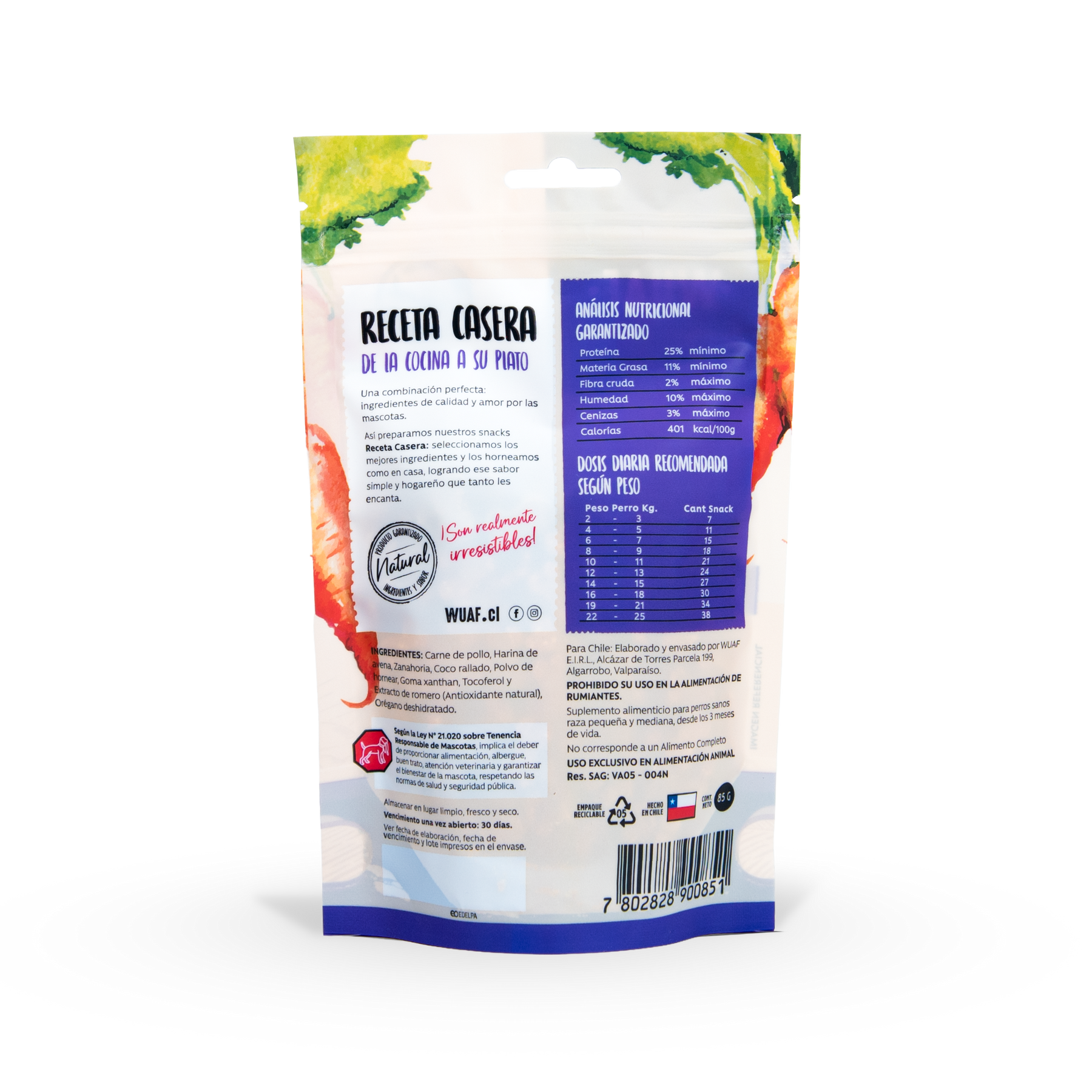 Ricas galletas horneadas, elaboradas con pechuga de pollo, harina de avena y zanahoria. Tienen una textura firme y fácil de morder, con sabores naturales, perfectas para regalonear a tu perrito en cualquier momento del día.