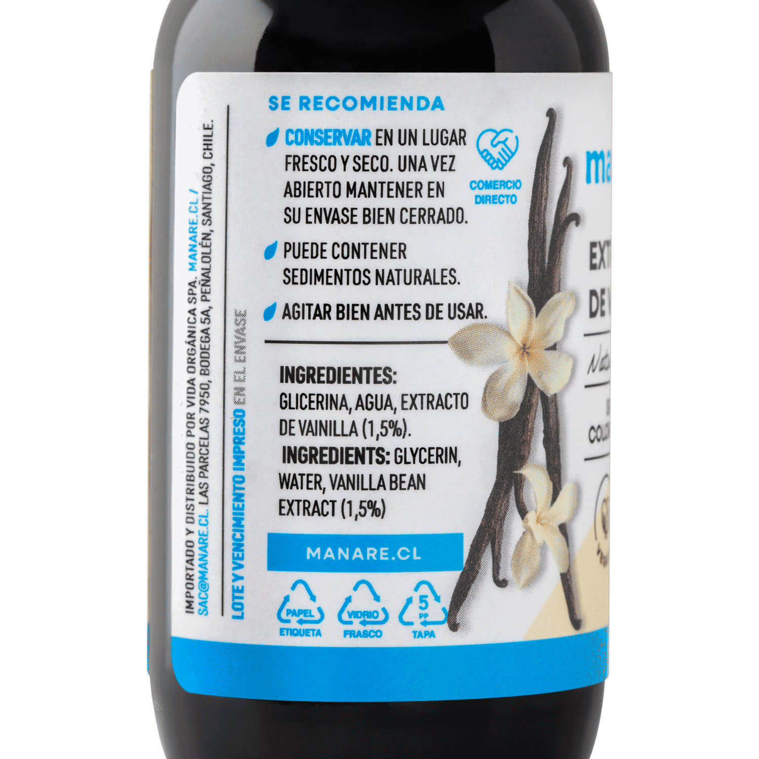 Disfruta del auténtico sabor de la vainilla con el Extracto de Vainilla Manare, una opción 100% natural, sin alcohol ni azúcar, ideal para realzar el sabor de tus recetas favoritas. Hecho con ingredientes simples y bajo prácticas sostenibles, este extracto es perfecto para postres, bebidas y más.