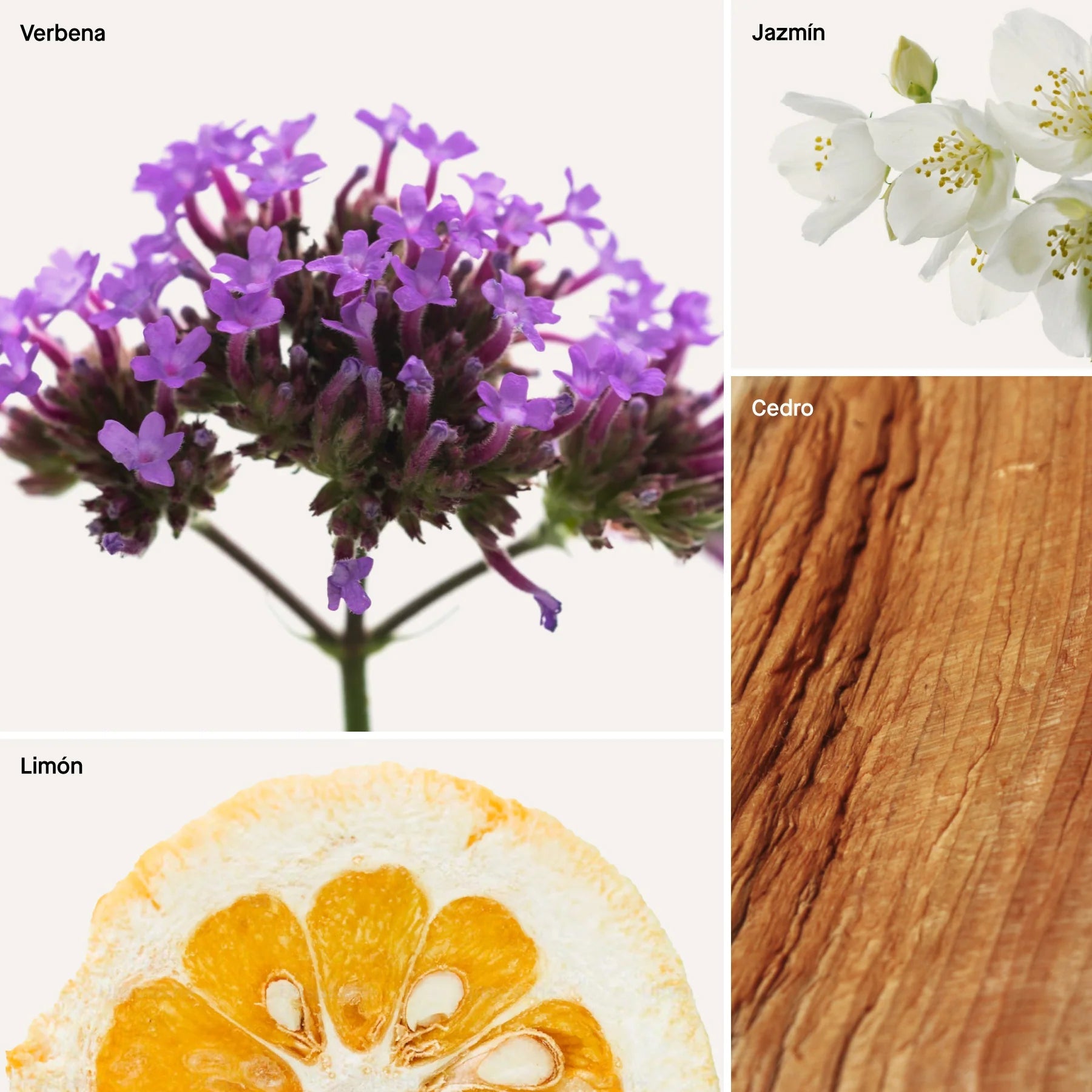 Notas cítricas de Verbena, limón, menta, jazmín, madera de cedro y naranja.